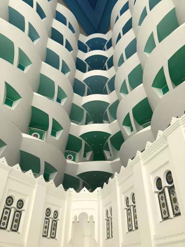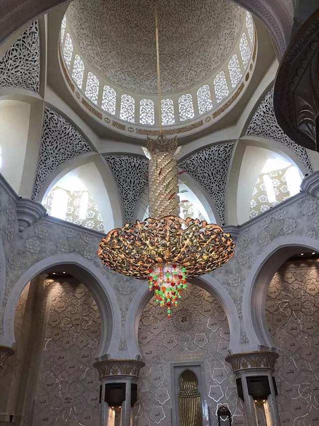 謝赫扎耶德清真寺是為已故老國王扎伊德所建,是阿聯(lián)酋的標志性建筑﹐整個建筑群都用來自南斯拉夫的白玉大理石,莊嚴肅穆,充分體現(xiàn)了伊斯蘭的風(fēng)格。